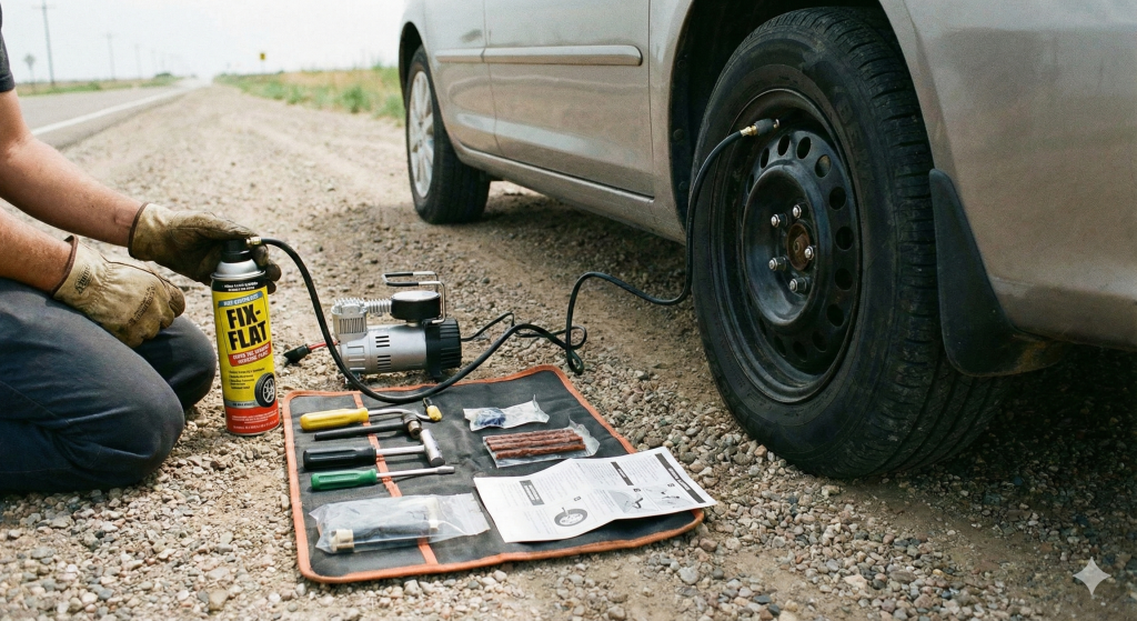 - 「パンクしたけど修理材あって良かった。これで直そう。」